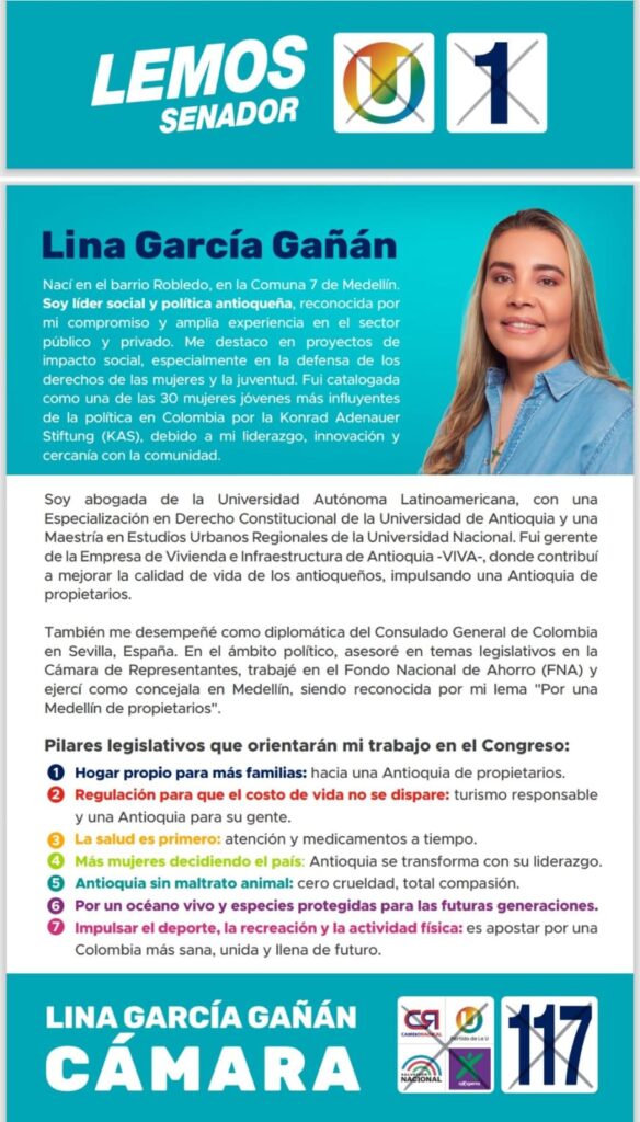 Soy abogada de la Universidad Autónoma Latinoamericana, con una Especialización en Derecho Constitucional de la Universidad de Antioquia y una Maestría en Estudios Urbanos Regionales de la Universidad Nacional. Fui gerente de la Empresa de Vivienda e Infraestructura de Antioquia -VIVA-, donde contribuí a mejorar la calidad de vida de los antioqueños, impulsando una Antioquia de propietarios.